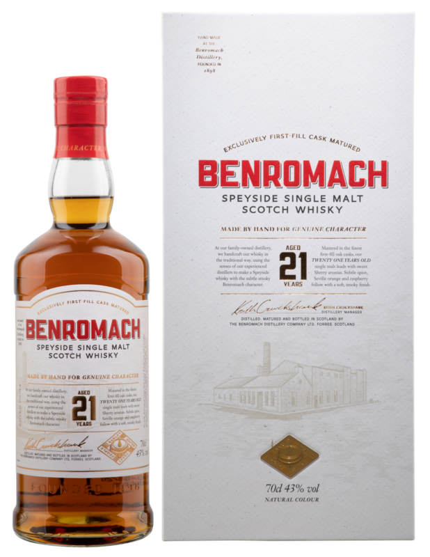 Als neustes Mitglied in der Classic-Linie von Benromach, ist auch dieser 21-Jähriger Single Malt in First Fill Bourbon und Sherry Fässer gereift worden. Der erste Batch wurde aus Whiskys gewonnen die im Jahr der Wiedereröffnung destilliert wurden.