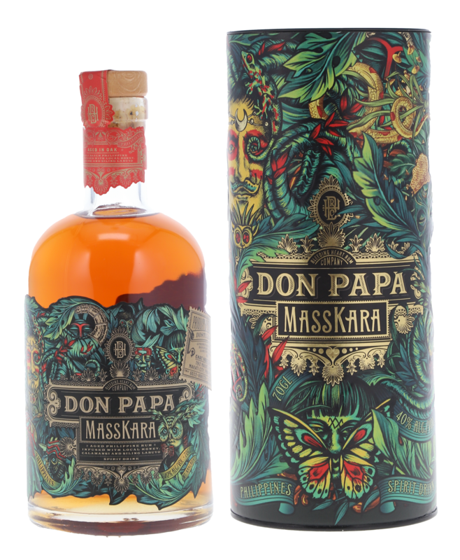 Der Rum Don Papa Masskara aus den Philippinen ist eine limitierte Abfüllung. Dafür wird ausschliesslich Zuckerrohr aus der Insel Negros gebraucht, eine philippinische Insel die auch als 'Zuckerdose' der Philippinen bezeichnet wird. Danach reift er für eine unbestimmte Zeit in Eichenfässer. Die auffallende Etikette ist nach dem Masskara-Fest gezeichnet worden, ein traditionelles Volksfest das jedes Jahr auf der Insel Negros gefeiert wird.