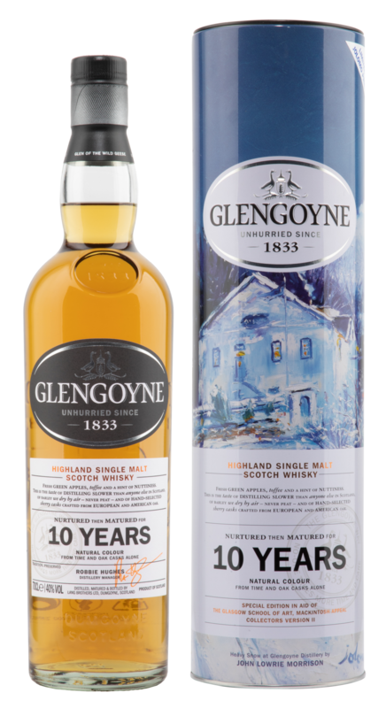 Une particularité de Glengoyne lors du maltage est qu'ils n'utilisent pas de tourbe, mais qu'ils font sécher l'orge sur de la houille. Cela permet à l'orge d'acquérir une note aromatique forte sans développer d'arôme de fumée. L'eau utilisée provient du Loch Carron, une source située en altitude dans les montagnes, qui est très douce en raison de son écoulement à travers la roche volcanique et qui donne à Glengoyne son goût fruité typique. Cette mise en bouteille spéciale et limitée du Glengoyne 10 Years classique est un projet caritatif. Elle est destinée à la Glasgow School of Art Mackintosh Appeal, qui a été en partie détruite dans un incendie.